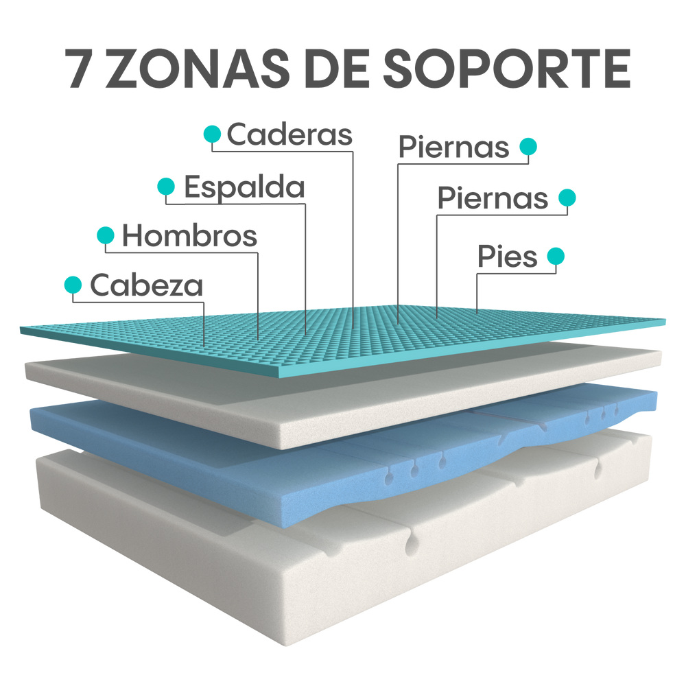 - 7 zonas de confort y soporte ultra localizadas, adaptándose a cada curvatura de tu cuerpo y evitando así los puntos de presión.
